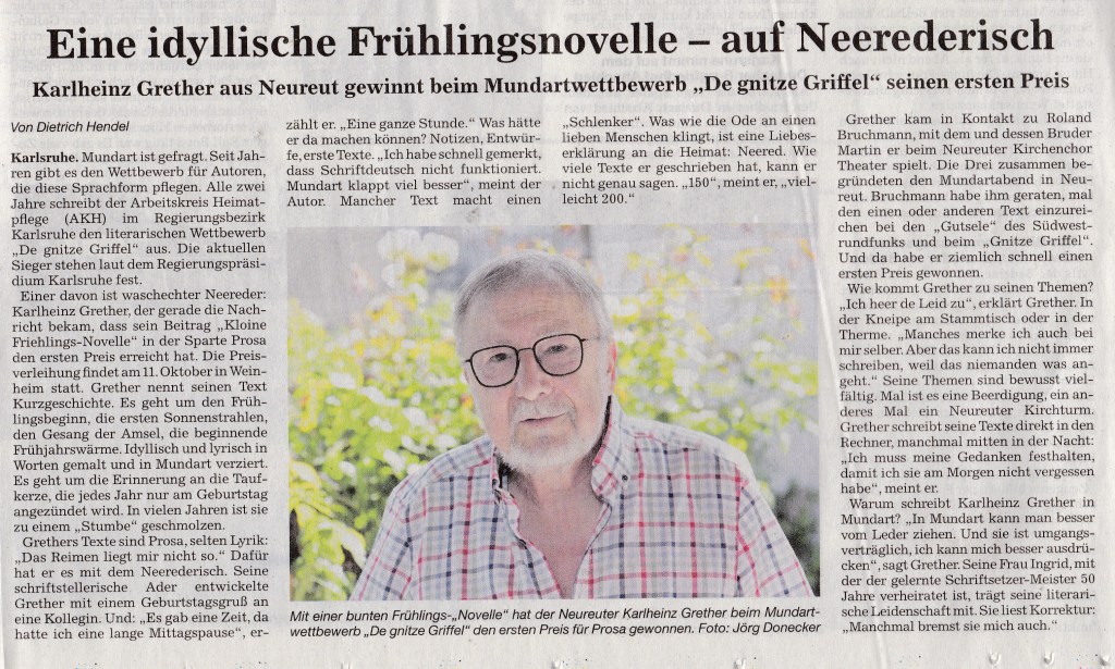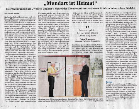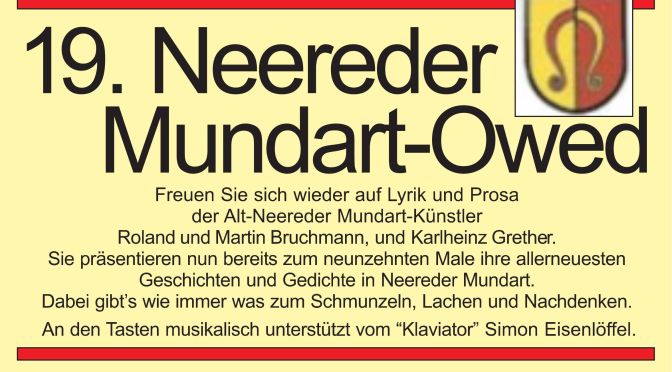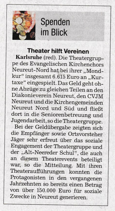 Komme Se, lache Se, un duhn Se debei a noch ebbes Gutes, weil de Erlös von denne Ufführunge (Ei’tritts- un Bewirtungsgelder) wie immer vollschdändich un ohne Abzüg für soziale Ei’richdunge in Neureut zur Verfügung gschdellt wird.